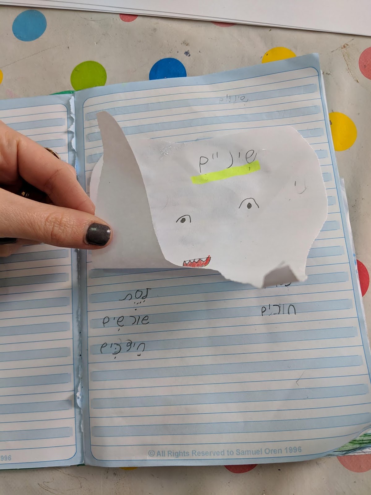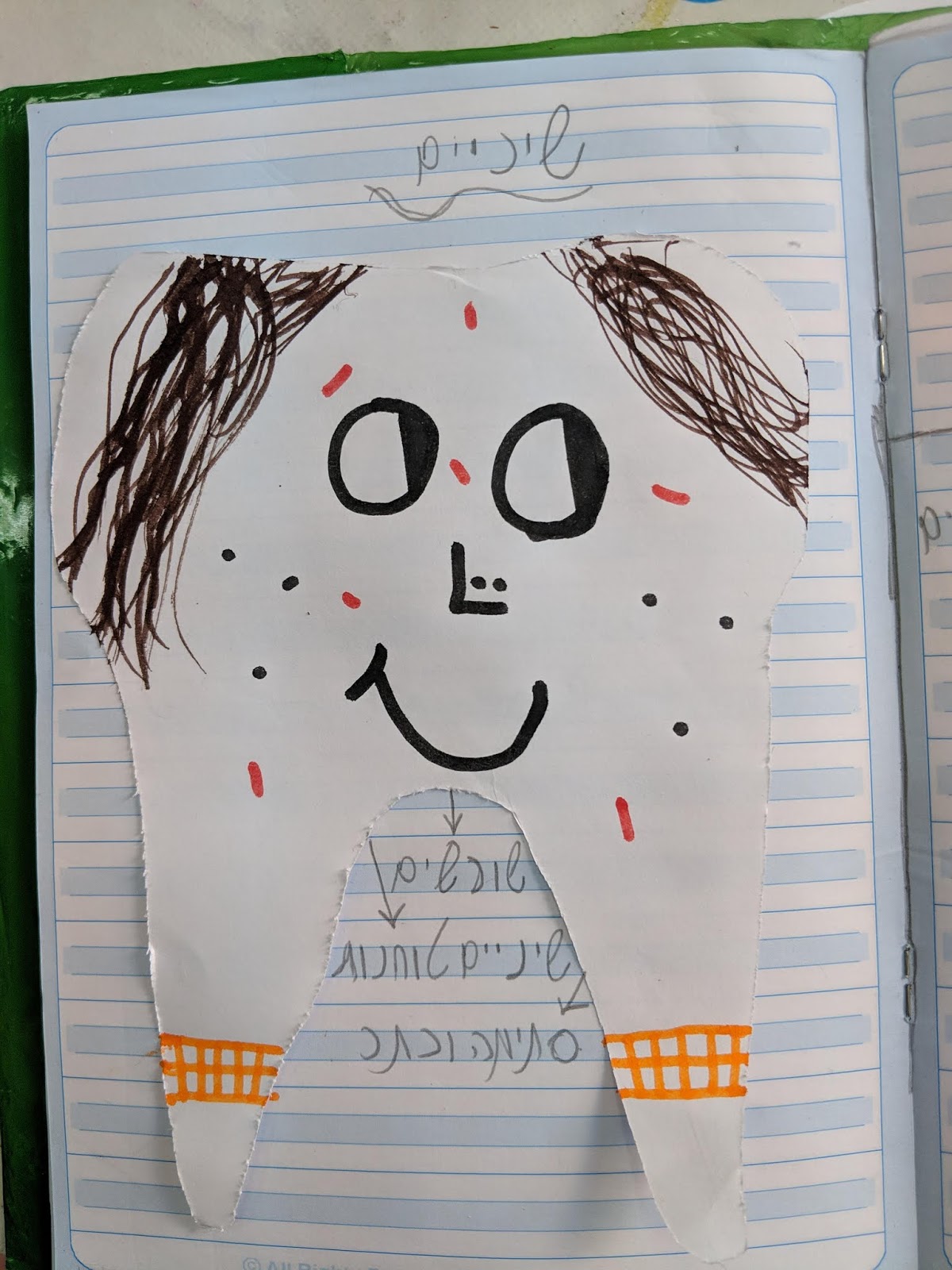 3. כל תלמיד קבל דף לבן בצורה של שן. הילדים כתבו את המילים שהיו כתובות על הלוח וקישטו את השיניים.